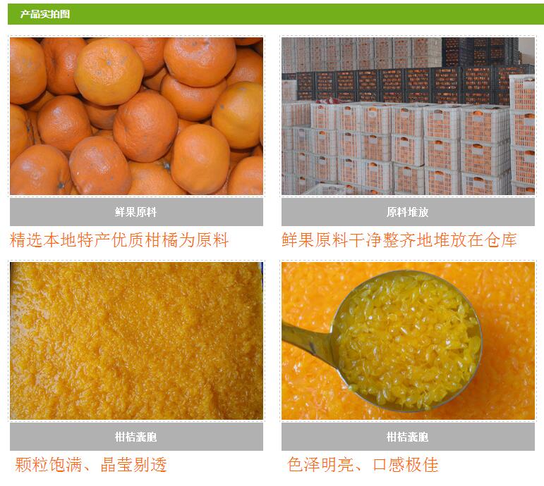 特性:以砂囊形态存在,颗粒饱满。本规格产品采用罐头工艺生产,不含防腐剂;较好地保持了柑橘特有的风味与营养价值。