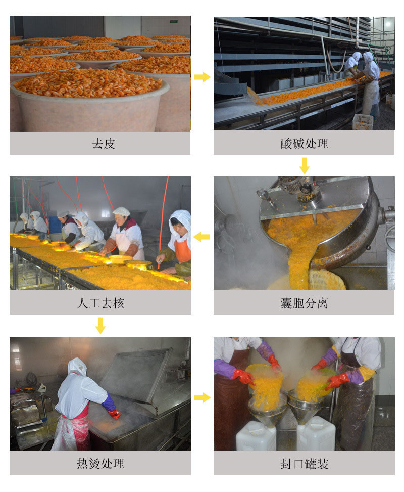 主要以柑桔为原料,经去皮、热烫、分离等工序制作而成